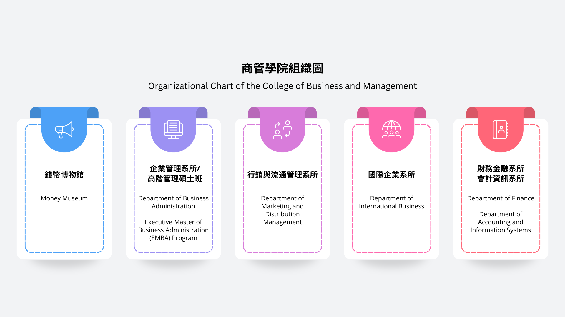 本學院的教學組織有企業管理系(所)(含高階經營管理碩士在職專班) (EMBA)、行銷與流通管理系(所)、國際企業系(所)、財務金融系(所)、會計資訊系(所)。招生類別有碩士班、碩士在職專班、日四技及進修部,各學制類別完備,充分提供中台灣莘莘學子及在職人士良好的進修管道。