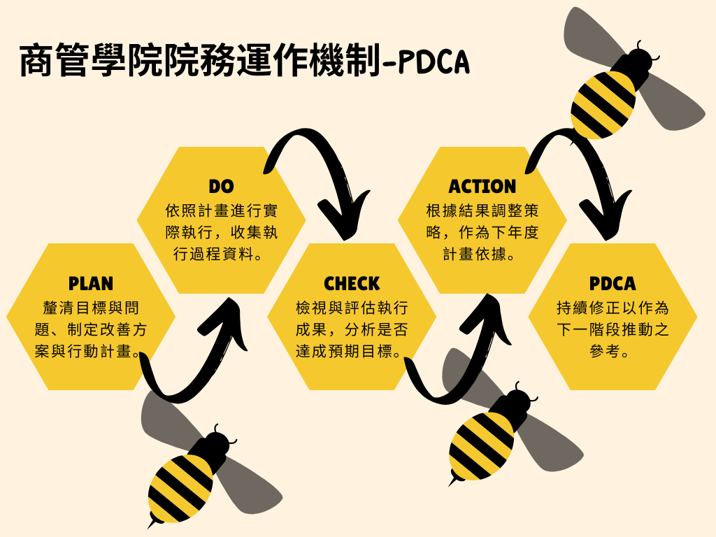 本學院院內整體性機制依學校整體發展與院務推動考量,整合院內各系所設備,投入教學、研究、服務與輔導。院內各系所教師並積極參與發展系所務,協助課程規劃。院務方面,本院院務發展依據PDCA流程,規劃、投入執行、檢核成果累積產出,持續修正以作為下一階段推動之參考,如圖所示。